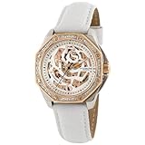 An amazing design with intricate style radiates from the dial of the Stuhrling Original Women's Lifestyle 'Madame Nemo' Automatic Skeleton Watch. A round gold-tone case and bezel showcase a brushed finish, and the diamond-filled bezel sparkles in any light. A white dial features a unique rose cut-out skeleton offering a glimpse of the mechanics stowed beneath the dial. Luminous gold-tone Arabic numerals are displayed at the six and 12 o'clock positions and luminous gold-tone hour and minute hands are offset by a black second hand and matching outside minute track. The white genuine pigskin leather band is a perfect match to the dial and securely fastens with a buckle clasp. This Stuhrling Original timepiece features reliable automatic self-wind movement and is protected by a synthetic sapphire crystal. The watch is water resistant to a depth of 165 feet (50 meters).