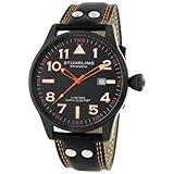 With a bold look and well-designed features, the men's Eagle watch by Stuhrling is sleek enough for stylish urban wear and rugged enough for tough, real-world use. The 44-millimeter black stainless steel case has an appealing circular design, and the black dial features big, easy-to-read luminous indexes consisting of orange-tinted Arabic numerals, bars, and a distinctive triangle at 12 o'clock. All three of the orange hands offer luminous tips, and the dial's outer edge has additional indexes to mark the seconds, with a handy date display at three o'clock. The black stainless steel bezel and black leather strap with orange contrast stitching and silver-toned rivets enhance the look of this masculine timepiece. The band closes with a secure buckle clasp, and the dial window is made of synthetic sapphire for extra durability. In addition, this Swiss-quartz movement watch is water resistant up to 165 feet.