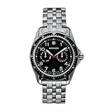 A great choice for outdoorsy pursuits such as hiking, mountaineering, and spelunking, the Wenger Alpine 2-Eye stainless steel men's watch features day and date subdials at the center of the black dial face. The large, round silver watch case has a brushed finish and it's topped by black bezel with 24-hour military time. Other dial features include a full Arabic numeral display (in classic Helvetica-style font), luminous hands (with red seconds hand), and small minute indexes. It's matched with a handsome stainless steel bracelet band with grooved accents. Other features include the classic Swiss Army insignia at 12 o'clock, precise 5-jewel Swiss quartz movement, a scratch-resistant mineral crystal, and water-resistance to 100 meters (330 feet)--suitable for a variety of snow and water sports.